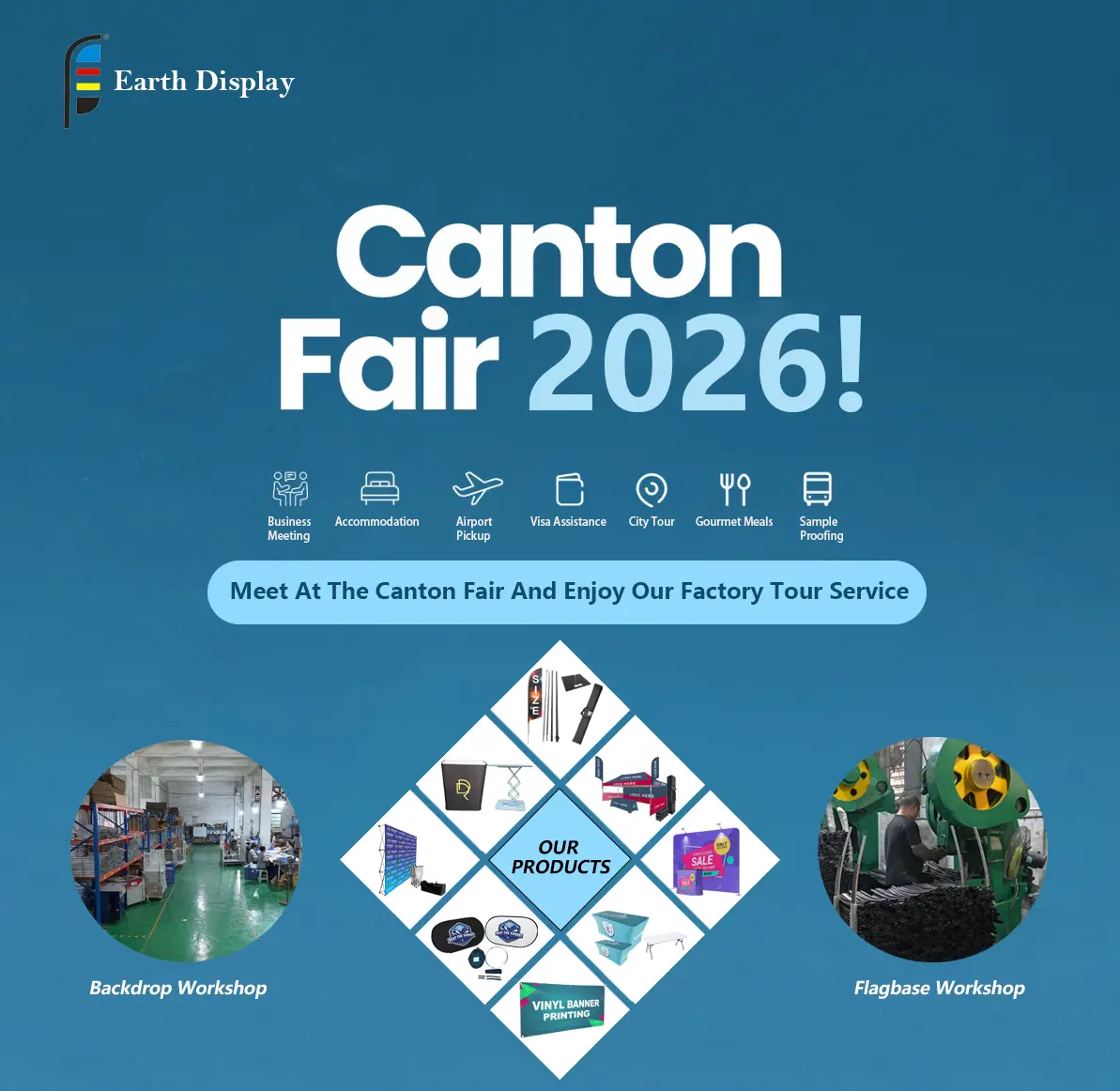 2026년 캔톤 페어(Canton Fair)가 다가오고 있습니다. Earth Display에서 여러분을 그곳에서 뵙기를 진심으로 바랍니다. 우리는 깃털 깃발, 팝업 배경막, 깃발 베이스, 맞춤형 비닐 배너 등 기본적으로 전시회 및 광고용 모든 제품을 10년 넘게 제작해 왔습니다. 이번에는 온라인으로만 이야기하는 것이 아니라, 직접 대면하여 저희가 하는 일을 보여드리고 싶습니다.